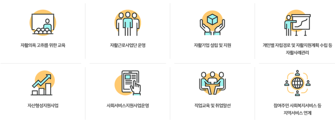 ※ 국민기초생활보장법에서 정한 자활사업은 단순보호가 아닌 국가 책임을 강화하는 종합적 빈곤대책으로써 수급권자의 권리성을 부각하고 빈곤에 대한 사회적 책임을 강조했다는 점에서 도입에 큰 의미가 있습니다.
